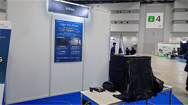 独自開発された低照度・高感度カメラをフレーム中央に備え、僅かな光を増幅して、デジタル映像としてアイウェアに表示する暗所支援眼鏡 NOZOMi(のぞみ)」を紹介